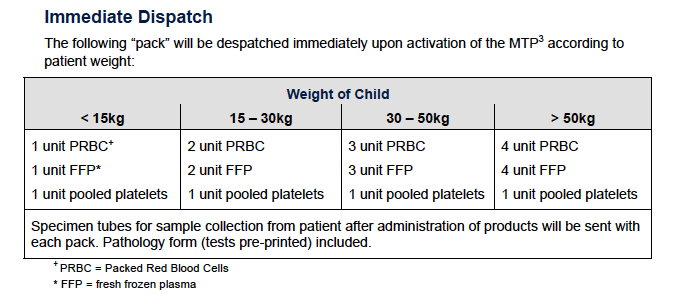 - Massive Transfusion Protocols help and emphasise the need for not just the red stuff but good amounts of a fibrinogen source (locally that’s cryoprecipitate rather than fibrinogen complex concentrates, platelets and FFP. A quick Google search will find the guideline used at The Children’s Hospital at Westmead and the breakdown of what comes first…